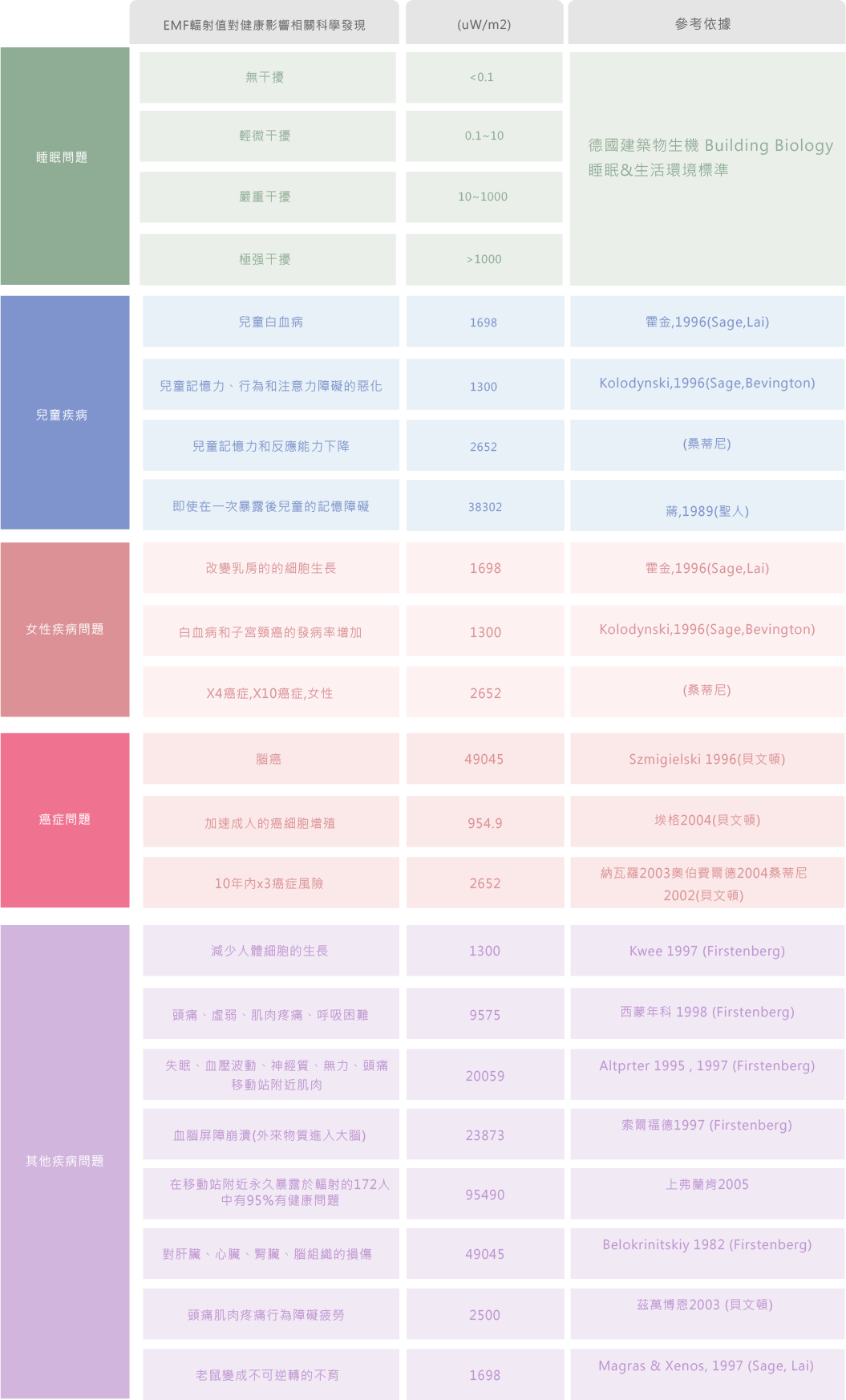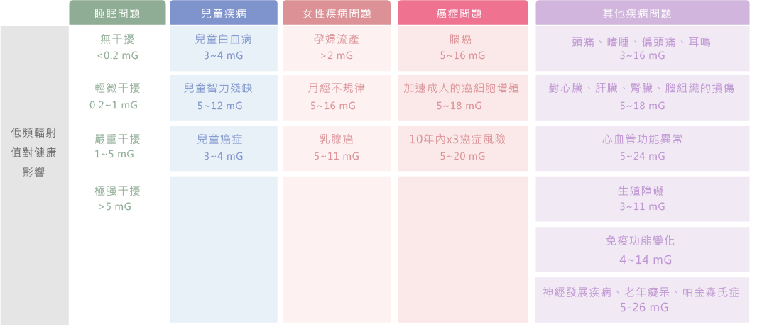 使身體抵抗力下降。動物實驗和對人群受輻射作用的研究和調查表明,人體的白血球吞噬細菌的百分率和吞噬的細菌數均下降。此外受電磁輻射長期作用的人,其抗體形成受到明顯抑制。超過1mG時:兒童白血病的罹患率較一般兒童高。